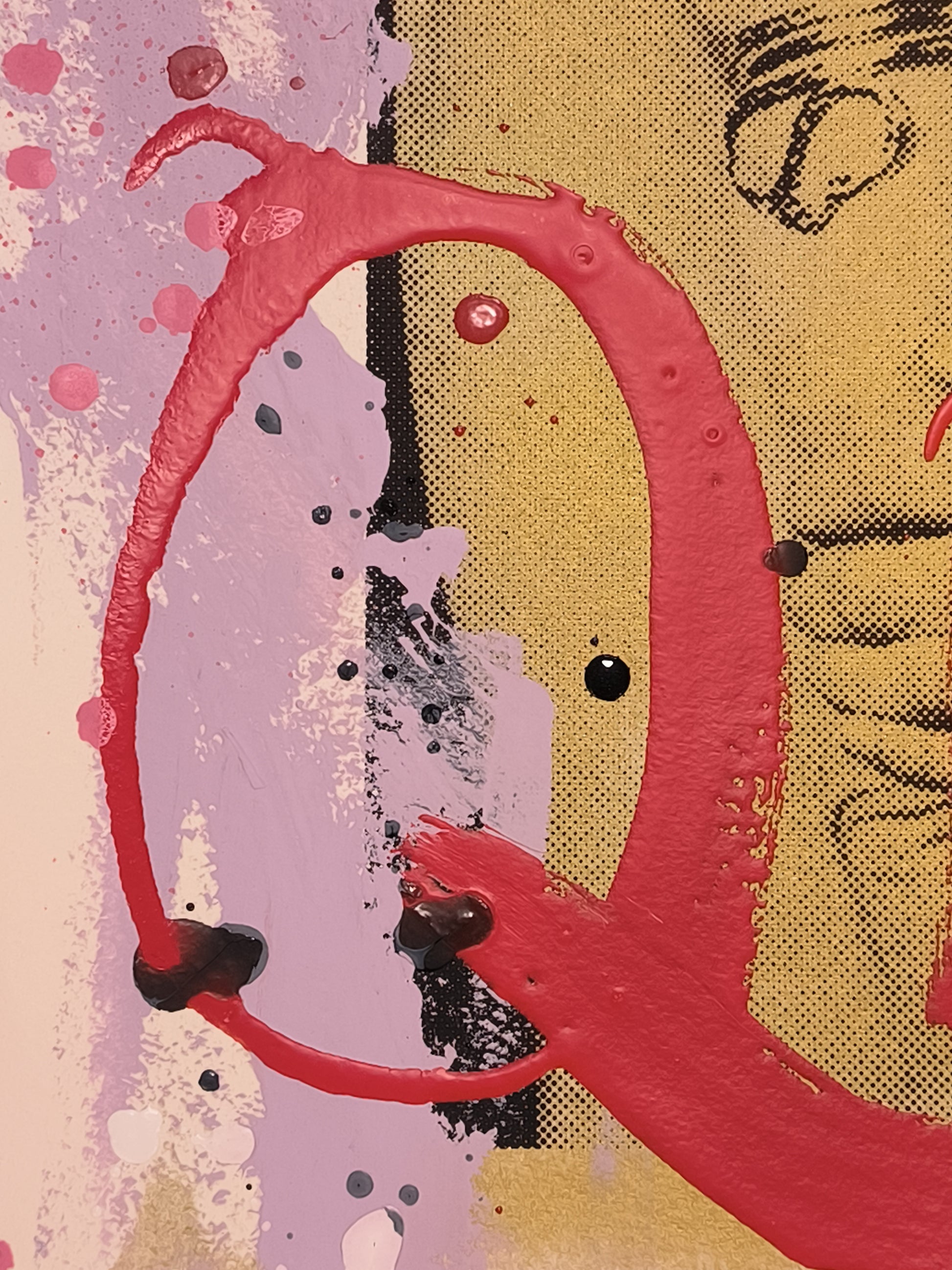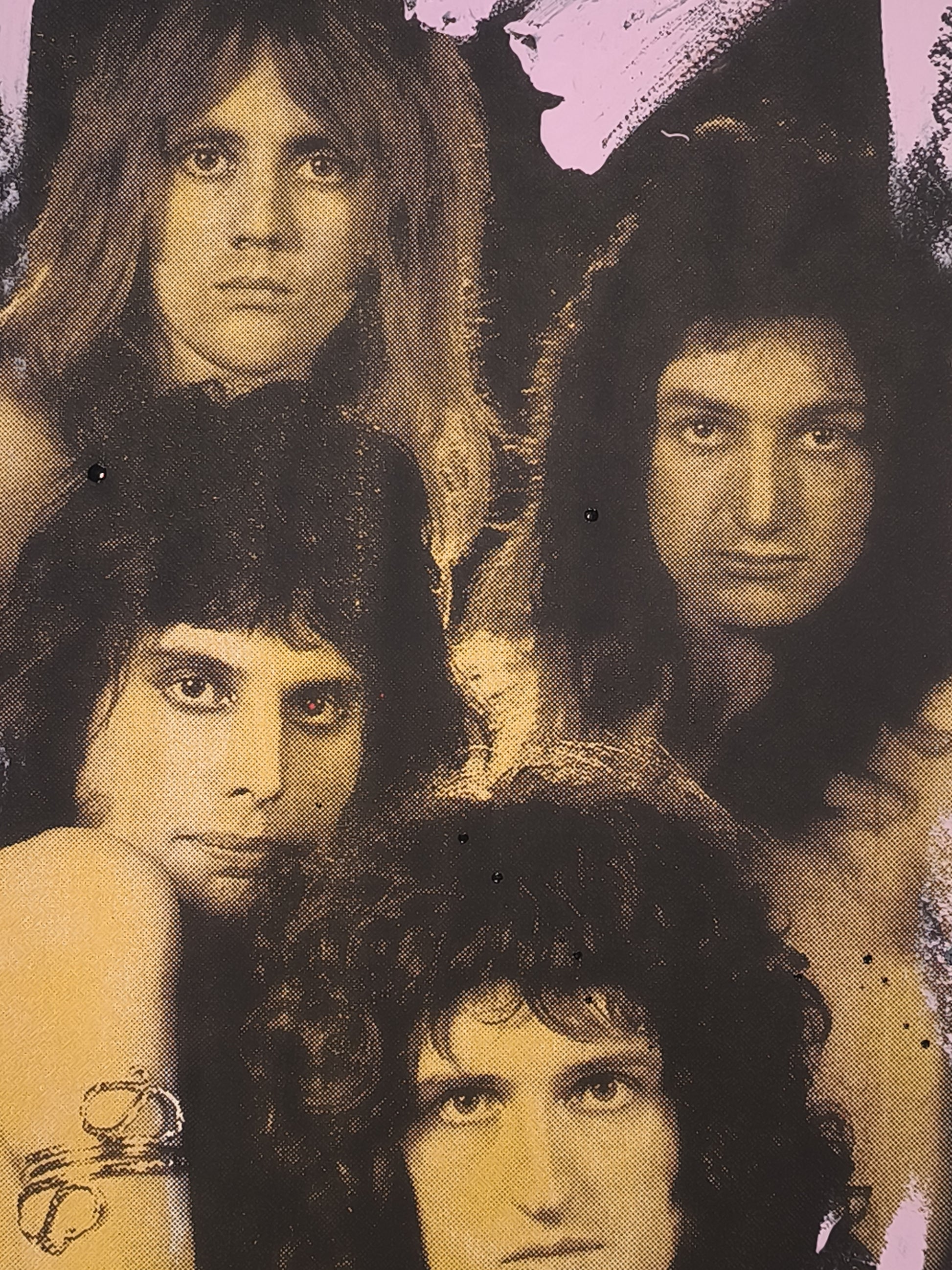 EN: This iconic photo of rock's most influential band, reinterpreted using mixed media, immortalizes the electrifying essence of Queen. Powerful graffiti-style lettering over a monochromatic portrait of the group conveys strength, attitude, and boundless expression.